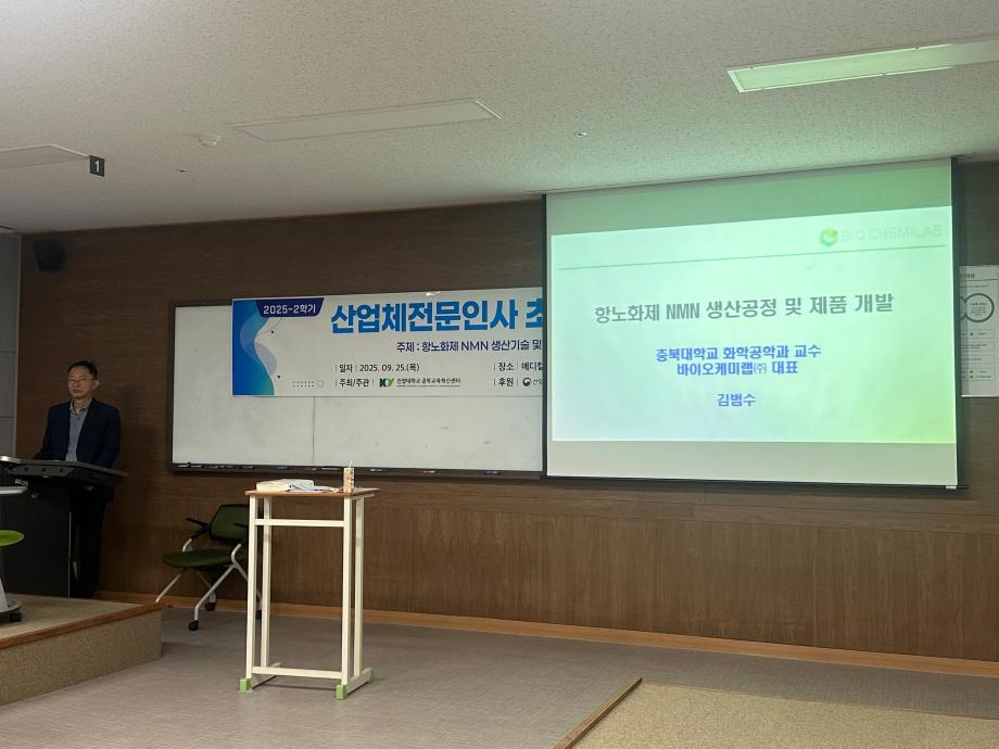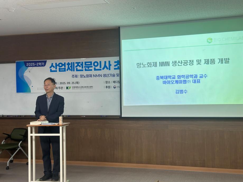 주제 : 9월 25일 항노화제 NMN 생상공정 및 제품 개발 강사 : 충북대학교 화학공학과 교수 바이오케미랩(주) 대표 김범수 장소 : 메디컬캠퍼스 죽헌정보관 203호 일시 : 2025.09.25(목) |