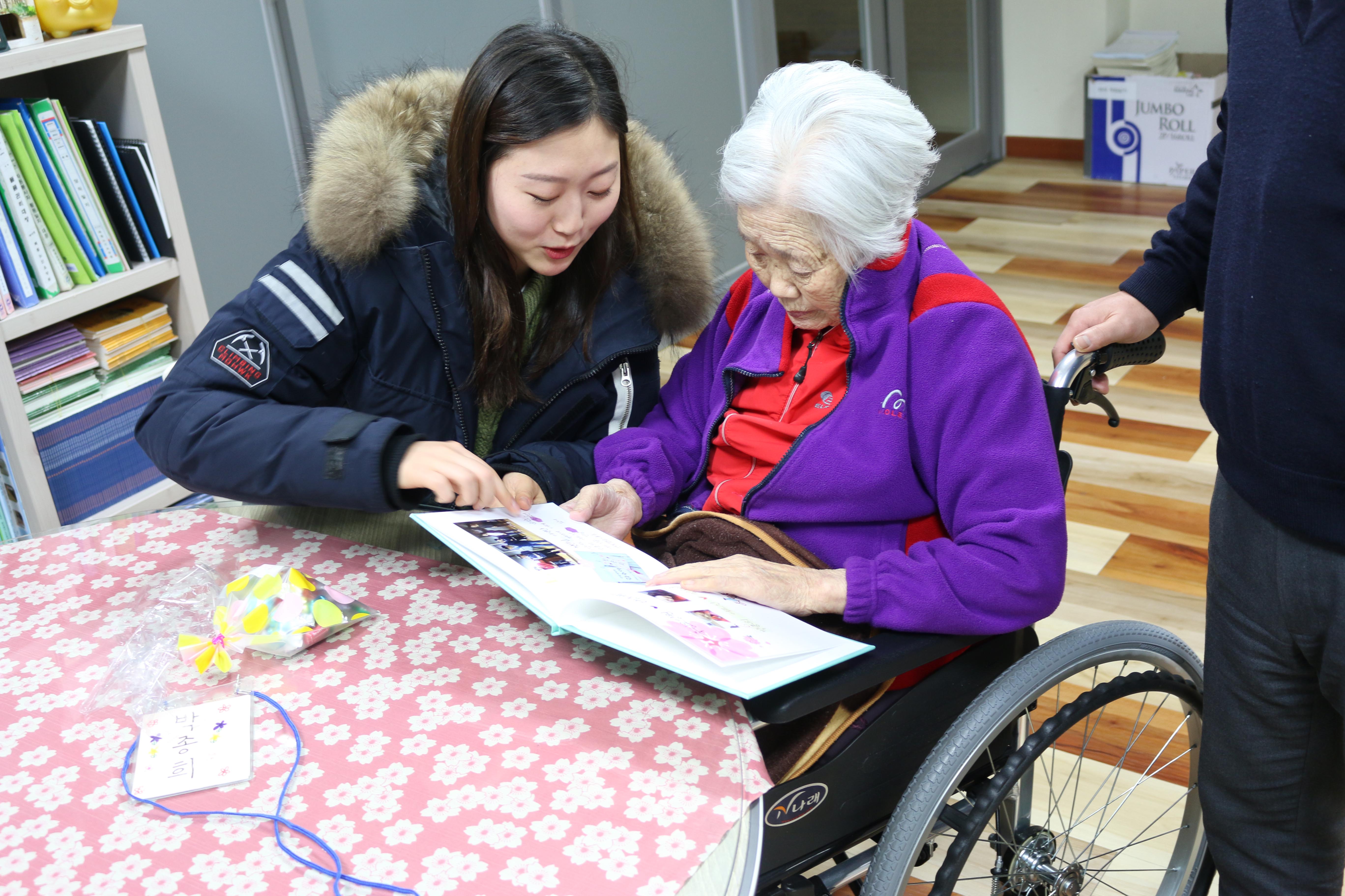건양대 학생이 어르신에게 포토에세이 책을 전달하고 같이 보고 있다.jpg