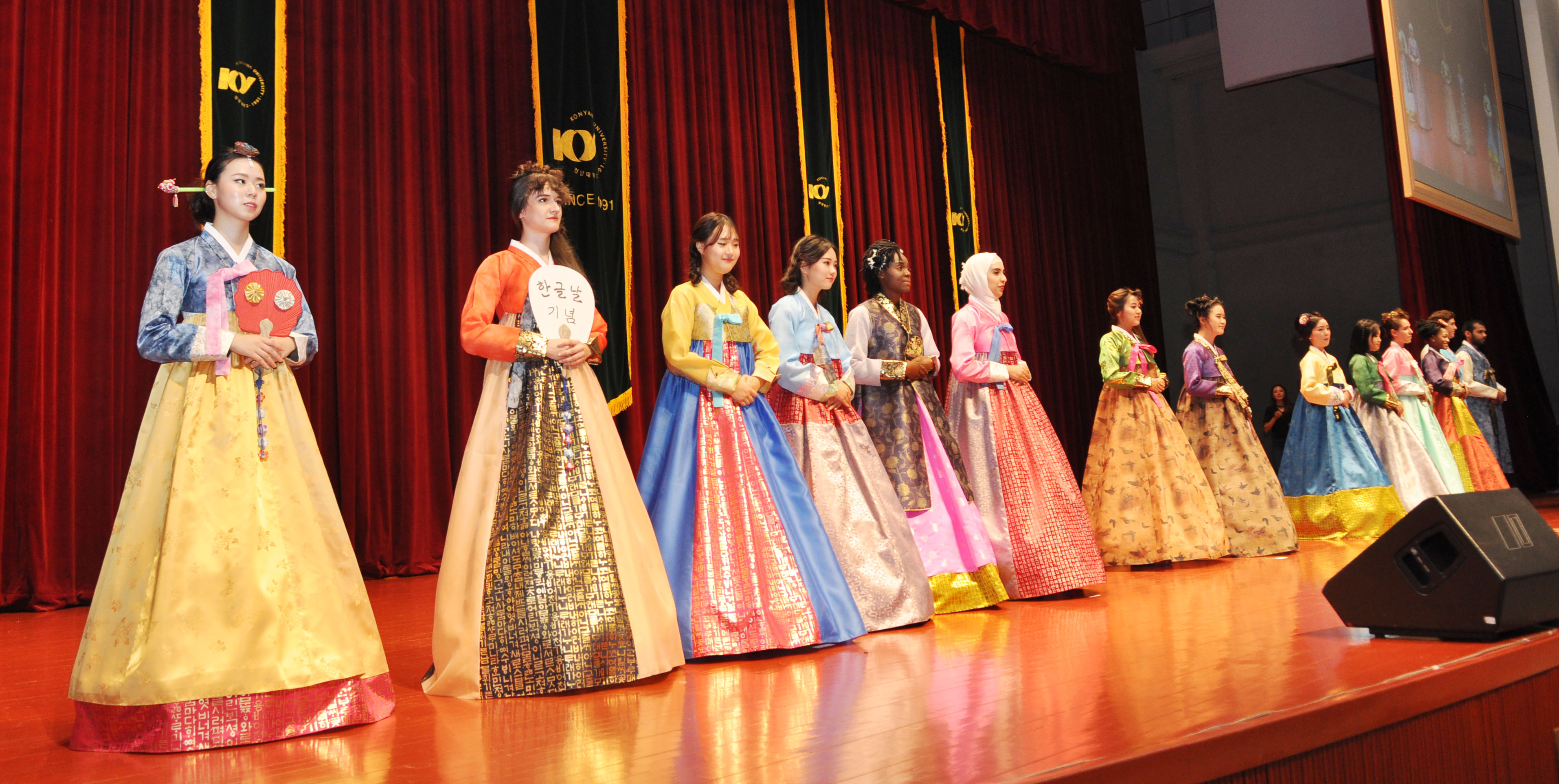 훈민정음 반포 570돌 기념 한글날을 앞두고 건양대학교(총장 김희수)에 재학 중인 외국인 학생들이 5일 다양한 한글 관련 행사를 체험하며 즐거운 시간을 가졌다. 건양대 정부초청 외국인 대학원 장학생(GKS) 130여명은 이날 저녁 6시30분부터 건양대 논산 창의융합캠퍼스 콘서트홀에서 <아름다운 한복 패션쇼> 및 <한글 골든벨> 등 한글을 주제로 한 프로그램에 참여했다. <아름다운 한복 패션쇼>는 한국인 학생 6명, 유학생 8명이 한글이 디자인된 한복을 입고 헤어 및 한복 패션쇼를 펼치며 우리 한복문화에 대해 알아보는 시간을 가졌다. 이어 열린 <한글 골든벨>은 김동혁 아나운서의 진행으로 한국학생과 유학생이 400명이 함께 한글에 대한 다양한 퀴즈를 풀며 우리의 한글에 대해 알아봤다. 이날 행사에 참여한 케냐에서 온 외국인 유학생 안토니씨(34세)는 “한글이 새겨진 아름다운 한복도 보고 공부하면서 몰랐던 한글의 지식도 알게 되어 재밌었다”라고 소감을 밝혔다. 건양대는 지난 6월 2016, 2017 정부초청 외국인 대학원 장학생 한국어 연수기관으로 선정된 바 있다. 현재 중국, 몽골, 유럽, 아프리카 등 54개국에서 온 160명의 학생들이 건양대에서 한국어 연수과정을 밟고 있다.