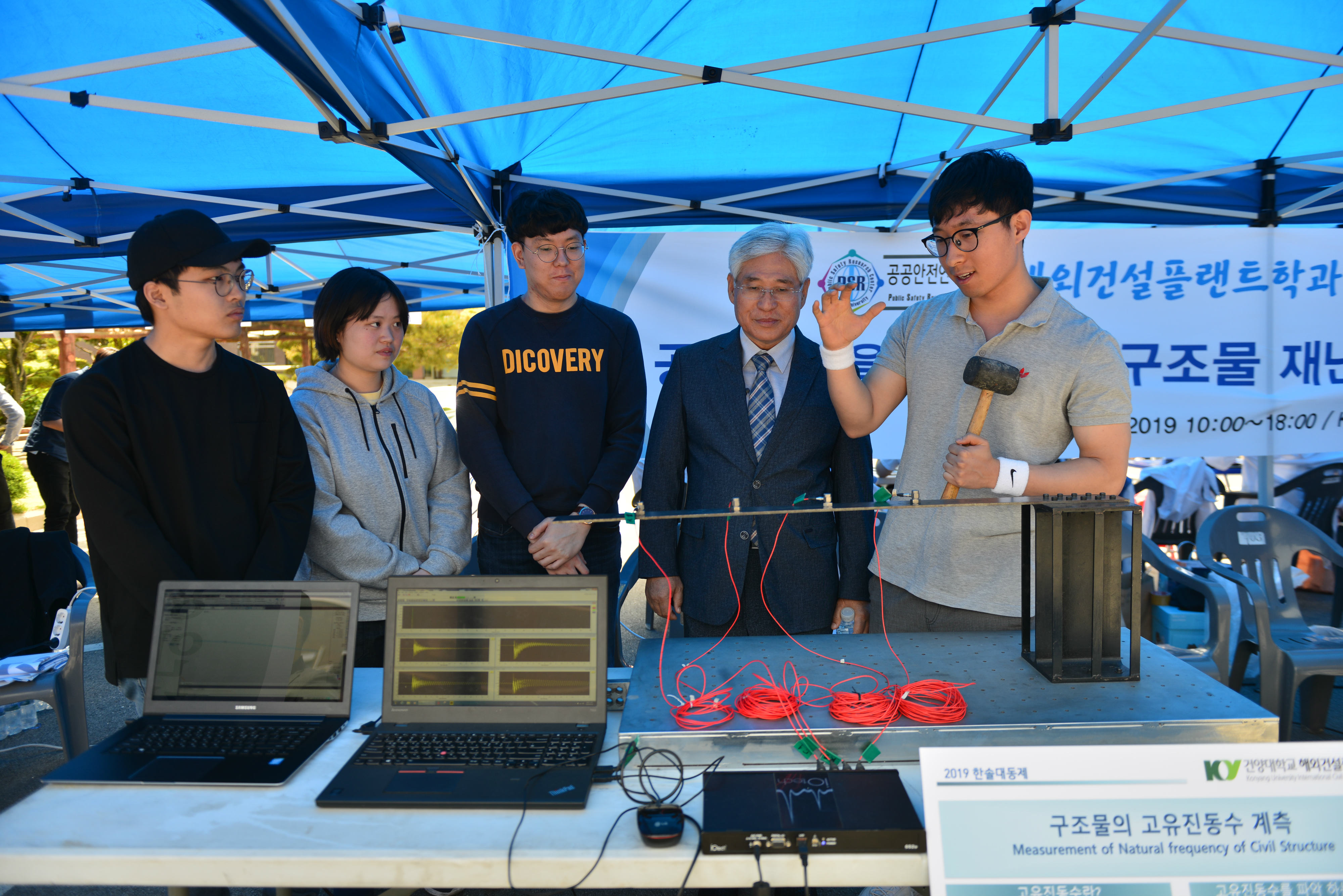 건양대 해외건설플랜트학과, 공공안전연구소 프로그램 참여 성과 전시회 개최 건양대학교(총장 이원묵) 공공안전연구소(소장 허광희)가 8일부터 9일까지 이틀간 진행되는 건양대학교 한솔대동제에서 ‘공공안전을 위한 건설구조물 재난예방기술 홍보 전시회’를 개최했다. 공공안전연구소 연구원과 건양대 해외건설플랜트학과 재학생 등 60여명이 함께 참여한 이번 전시회는 ‘구조물의 고유진동수 계측장비’, ‘사장교 진동제어 장치’ 등 공학전공지식이 공공안전 분야에 적용돼 재난을 예방하는 사례를 비전공 재학생 및 일반인이 알기 쉽게 소개함으로써 공공안전에 관심을 갖도록 기획됐다. 특히 공공안전연구소 인력양성 프로그램에 참여한 학생들이 본인들이 진행한 전공동아리 활동과 캡스톤디자인 등 각종 경진대회에 참가하면서 갈고닦은 지식을 실제 우리 사회의 공공안전에 적용하고 활용하는 사례를 적극 소개하는 시간을 가졌다. 이번 전시회에 참여해 실제 공공안전기술을 시연한 참가 학생들은 “공학전공지식이 건설 분야와 접목되어 공공안전에 기여하는 사례를 소개할 수 있는 기회를 갖게 되어 보람 있었다”며 “큰 인명피해를 불러올 수 있는 대형재난이 사전에 잘 대처하면 충분히 예방할 수 있다는 것을 앞으로도 꾸준히 알려나갈 것”이라고 밝혔다. 한편 2018년 교육부와 한국연구재단이 주관하는 ‘이공분야 대학 중점 연구소 지원사업’에 선정된 건양대 공공안전연구소는 9년간 약 57억원을 지원받아 재난안전에 관한 연구를 수행하며 공공안전에 기여할 인력양성 및 기술개발을 진행하고 있다.