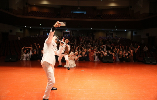 건양대에 머무는 스카우트잼버리 헝가리 참가대원들을 위한 공연이 펼쳐지던 중 공연을 펼치던 연기자들이 잼버리대원들과 함께 기념사진을 찍는 모습.jpg