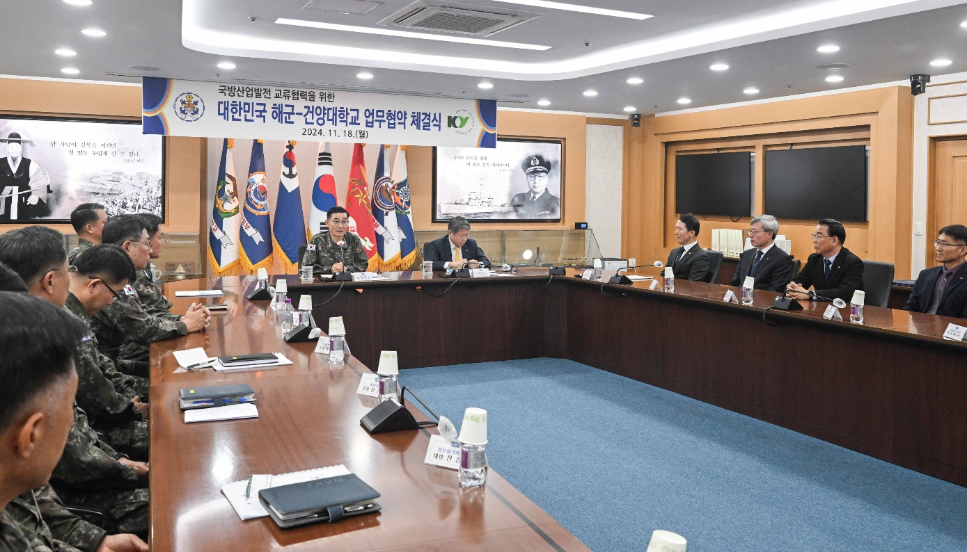 건양대와 해군본부는 18일 충남 계룡시 계룡대에 위치한 해군본부에서 양 기관 상호 교류 및 발전방향 모색 및 국방산업 발전을 협력하는 내용의 업무협약을 체결했다.jpg