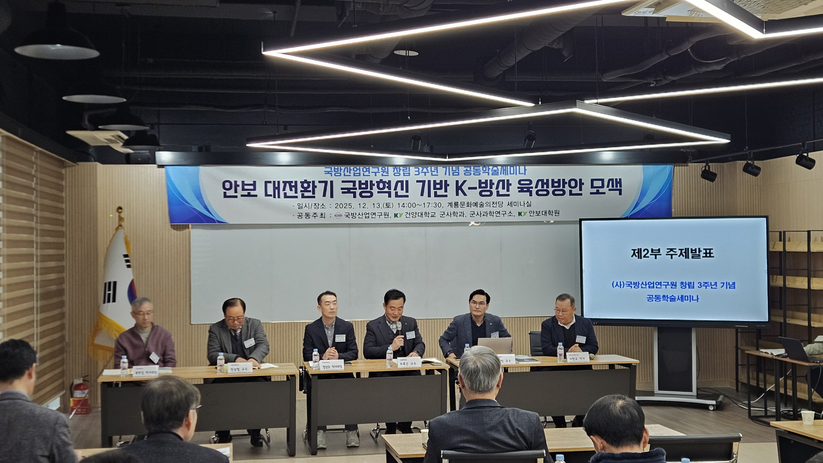 이어서 12월 13일에는 건양대학교 국방산업연구원(원장 이종호)과 공동으로 '안보 대전환기 국방혁신 기반 K-방산 육성방안 모색'이라는 주제로 학술 세미나를 개최했다. 이 세미나에는 연구원의 연구위원들과 건양대학교 군사학과 및 군사과학연구소 교수진, 박사과정생 등 60여 명이 참석하여 K-방산 육성 전략을 심도 깊게 논의했다. 이종호 국방산업연구원장은 "산·학·연·관·군 협력체제 기반의 국방산업 육성 방안을 제시하며, 한국의 방산 생태계는 여전히 핵심 기술에 대한 해외 의존도가 높아 구조적인 혁신이 반드시 필요하다"고 밝혔다. 지효근 군사학과장은 계룡시가 지리적·군사적 여건이 뛰어난 국방산업 클러스터의 최적지임을 강조했으며, 홍준기 군사과학연구소장 역시 산·학·연·관·군 관련 기관의 긴밀한 협력이 대한민국 국방 수도 완성의 기반을 마련할 것이라고 역설했다. 주제 발표에서는 공통적으로 "AI·드론·유무인 복합체계 기반의 전력 혁신이 K-방산 경쟁력의 핵심"이라며 "민군 협력 생태계 구축 없이는 글로벌 시장에서 지속적인 성장도 어렵다"는 데 공감대를 형성했다.
