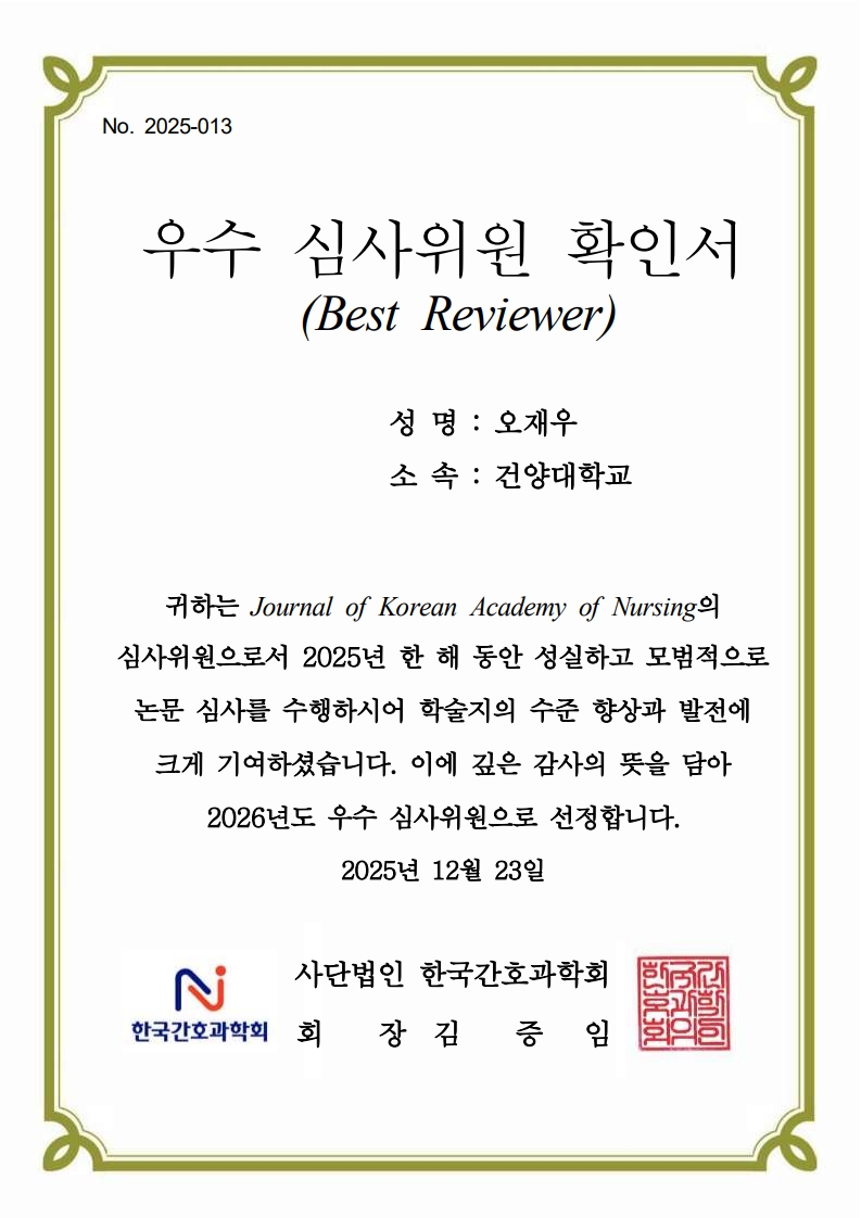 오재우 교수는 2025년 한 해 동안 'Journal of Korean Academy of Nursing'의 심사위원으로 활동했다. 그는 성실하고 전문적인 논문 심사 과정에서 학문적 엄정성과 공정성을 바탕으로 연구자들에게 건설적인 피드백을 제공했다. 이러한 기여로 간호학 분야의 학술적 발전에 크게 이바지했으며, 그 결과 한국간호과학회지 우수 심사위원으로 선정됐다.